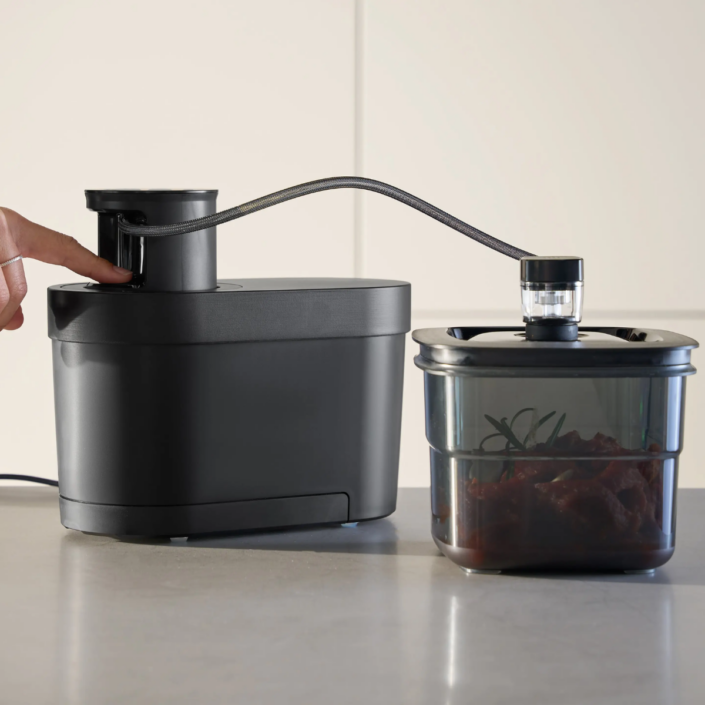 QVac er gemt ned i bordpladen når den ikke er i brug. Ved at give den et let tryk kommer den op fra bordet og er klar til brug. QVac har et enkelt brugervenligt display som tilbyder: vakuumering i poser, beholdere eller flasker samt marinering. Med QVac er det enkelt at gøre vakuumering af råvarer til en daglig rutine, som sikrer at du undgår madspild.